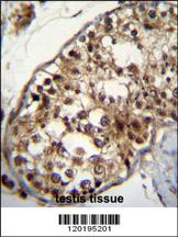 NUP160 Antibody (Center) (Cat. APR03617G)immunohistochemistry analysis in formalin fixed and paraffin embedded human testis tissue followed by peroxidase conjugation of the secondary antibody and DAB staining.This data demonstrates the use of NUP160 Antibody (Center) for immunohistochemistry. Clinical relevance has not been evaluated. |