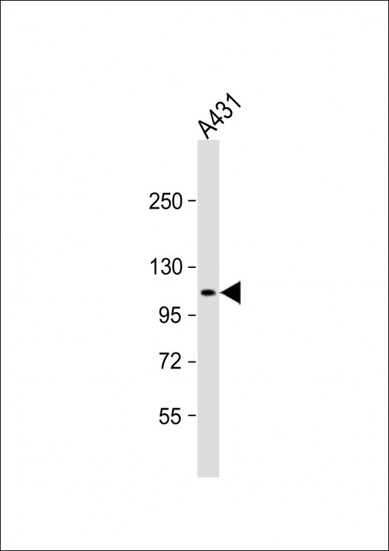 Anti-DEF Antibody (N-term) at 1:2000 dilution + A431 whole cell lysate Lysates/proteins at 20 μg per lane. Secondary Goat Anti-Rabbit IgG, (H+L), Peroxidase conjugated at 1/10000 dilution. Predicted band size : 87 kDa Blocking/Dilution buffer: 5% NFDM/TBST.