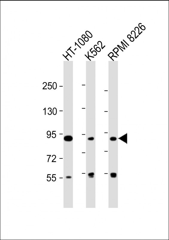 All lanes : Anti-DEF Antibody (N-term) at 1:2000 dilution Lane 1: HT-1080 whole cell lysate Lane 2: K562 whole cell lysate Lane 3: RPMI 8226 whole cell lysate Lysates/proteins at 20 μg per lane. Secondary Goat Anti-Rabbit IgG, (H+L), Peroxidase conjugated at 1/10000 dilution. Predicted band size : 87 kDa Blocking/Dilution buffer: 5% NFDM/TBST.