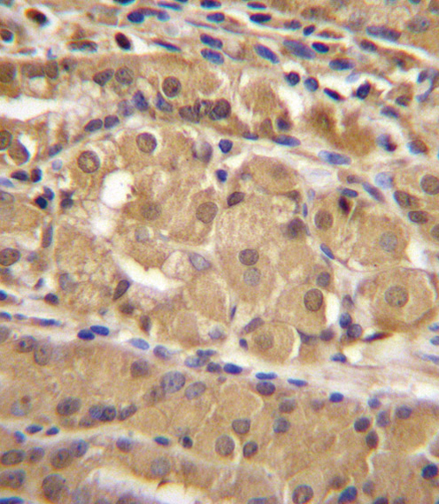 IRF9 Antibody (N-term) (Cat. APR03627G)immunohistochemistry analysis in formalin fixed and paraffin embedded human stomach tissue followed by peroxidase conjugation of the secondary antibody and DAB staining.This data demonstrates the use of IRF9 Antibody (N-term) for immunohistochemistry. Clinical relevance has not been evaluated. |