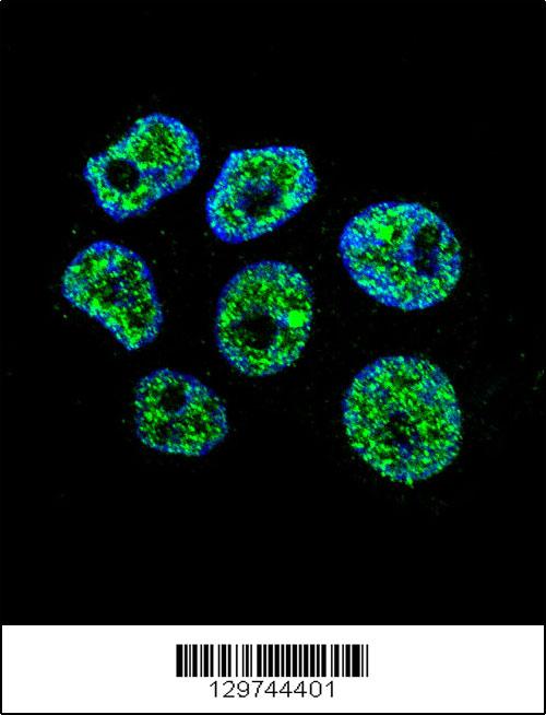 Confocal immunofluorescent analysis of WDR42C Antibody (N-term)( APR03631G) with ZR-75-1 cell followed by Alexa Fluor 488-conjugated goat anti-rabbit lgG (green). DAPI was used to stain the cell nuclear (blue). |
