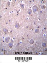 RAP1GDS1 Antibody (Center) (Cat. APR03637G)immunohistochemistry analysis in formalin fixed and paraffin embedded human brain tissue followed by peroxidase conjugation of the secondary antibody and DAB staining.This data demonstrates the use of RAP1GDS1 Antibody (Center) for immunohistochemistry. Clinical relevance has not been evaluated.