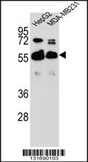RAP1GDS1 Antibody (Center) (Cat. APR03637G) western blot analysis in HepG2,MDA-MB231 cell line lysates (35ug/lane).This demonstrates the RAP1GDS1 antibody detected the RAP1GDS1 protein (arrow). |