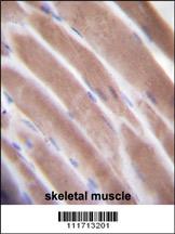 VEGF3 Antibody (N-term) (Cat. APR03638G)immunohistochemistry analysis in formalin fixed and paraffin embedded human skeletal muscle followed by peroxidase conjugation of the secondary antibody and DAB staining.This data demonstrates the use of VEGF3 Antibody (N-term) for immunohistochemistry. Clinical relevance has not been evaluated. |