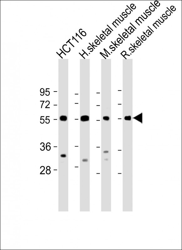 All lanes : Anti-TRIM72 Antibody (C-term) at 1:2000 dilution Lane 1: HCT116 whole cell lysate Lane 2: human skeletal muscle lysate Lane 3: mouse skeletal muscle lysate Lane 4: rat skeletal muscle lysate Lysates/proteins at 20 μg per lane. Secondary Goat Anti-Rabbit IgG, (H+L), Peroxidase conjugated at 1/10000 dilution. Predicted band size : 53 kDa Blocking/Dilution buffer: 5% NFDM/TBST.