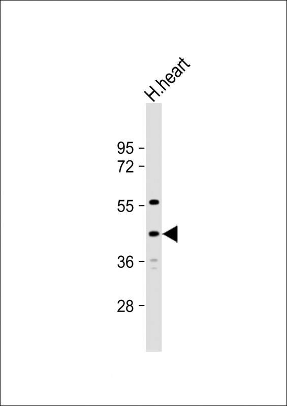 Anti-SAMD8 Antibody (N-term) at 1:1000 dilution + human heart lysate Lysates/proteins at 20 μg per lane. Secondary Goat Anti-Rabbit IgG, (H+L), Peroxidase conjugated at 1/10000 dilution. Predicted band size : 48 kDa Blocking/Dilution buffer: 5% NFDM/TBST.