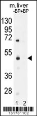 Western blot analysis of SAMD8 Antibody (N-term) Pab (Cat. APR03647G) pre-incubated without(lane 1) and with(lane 2) blocking peptide in mouse liver tissue lysate. SAMD8 Antibody (N-term) (arrow) was detected using the purified Pab. |