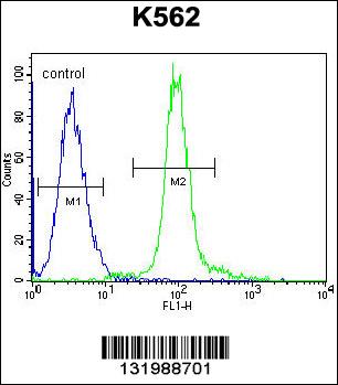 GLMN Antibody (C-term) (Cat. APR03649G) flow cytometric analysis of K562 cells (right histogram) compared to a negative control cell (left histogram).FITC-conjugated goat-anti-rabbit secondary antibodies were used for the analysis. |