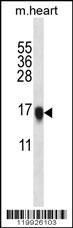 VSNL1 Antibody (Center) (Cat. APR03660G) western blot analysis in mouse heart tissue lysates (35ug/lane).This demonstrates the VSNL1 antibody detected the VSNL1 protein (arrow).