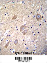 VSNL1 Antibody (Center) (Cat. APR03660G)immunohistochemistry analysis in formalin fixed and paraffin embedded human brain tissue followed by peroxidase conjugation of the secondary antibody and DAB staining.This data demonstrates the use of VSNL1 Antibody (Center) for immunohistochemistry. Clinical relevance has not been evaluated. |