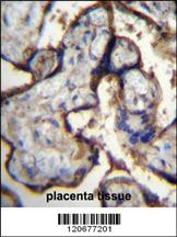 ITGA5 Antibody (Center) (Cat. APR03661G)immunohistochemistry analysis in formalin fixed and paraffin embedded human placenta tissue followed by peroxidase conjugation of the secondary antibody and DAB staining.This data demonstrates the use of ITGA5 Antibody (Center) for immunohistochemistry. Clinical relevance has not been evaluated.