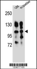 ITGA5 Antibody (Center) (Cat. APR03661G) western blot analysis in human uterine tumor and mouse bladder tissue lysates (35ug/lane).This demonstrates the ITGA5 antibody detected the ITGA5 protein (arrow). |