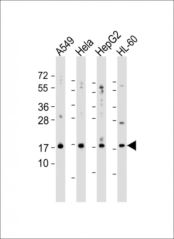 All lanes : Anti-SUMO2/3 Antibody (M1) at 1:2000 dilution Lane 1: A549 whole cell lysates Lane 2: Hela whole cell lysates Lane 3: HepG2 whole cell lysates Lane 4: HL-60 whole cell lysates Lysates/proteins at 20 μg per lane. Secondary Goat Anti-Rabbit IgG, (H+L), Peroxidase conjugated at 1/10000 dilution. Predicted band size : 11 kDa Blocking/Dilution buffer: 5% NFDM/TBST.