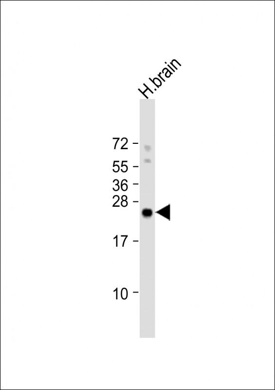 Anti-ARHB Antibody (Center) at 1:4000 dilution + human brain lysate Lysates/proteins at 20 μg per lane. Secondary Goat Anti-Rabbit IgG, (H+L), Peroxidase conjugated at 1/10000 dilution. Predicted band size : 22 kDa Blocking/Dilution buffer: 5% NFDM/TBST.