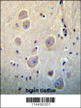 ARHB Antibody (Center) (Cat. APR03668G)immunohistochemistry analysis in formalin fixed and paraffin embedded human brain tissue followed by peroxidase conjugation of the secondary antibody and DAB staining.This data demonstrates the use of ARHB Antibody (Center) for immunohistochemistry. Clinical relevance has not been evaluated. |
