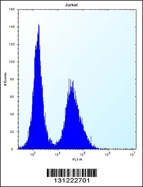 NBPF5 Antibody (C-term) (Cat. APR03681G) flow cytometric analysis of Jurkat cells (right histogram) compared to a negative control cell (left histogram).FITC-conjugated donkey-anti-rabbit secondary antibodies were used for the analysis. |