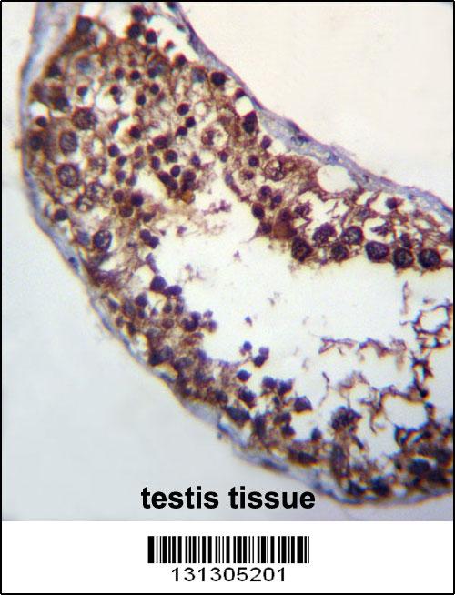 POMT1 Antibody (C-term) (Cat. APR03684G)immunohistochemistry analysis in formalin fixed and paraffin embedded human testis tissue followed by peroxidase conjugation of the secondary antibody and DAB staining.This data demonstrates the use of POMT1 Antibody (C-term) for immunohistochemistry. Clinical relevance has not been evaluated.