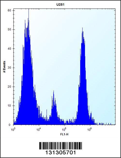 POMT1 Antibody (C-term) (Cat. APR03684G) flow cytometric analysis of U251 cells (right histogram) compared to a negative control cell (left histogram).FITC-conjugated goat-anti-rabbit secondary antibodies were used for the analysis. |