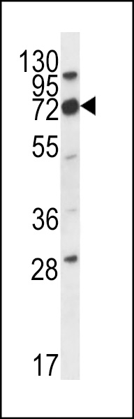 Anti-IGSF8 Antibody (Center) at 1:1000 dilution + human brain lysate Lysates/proteins at 20 μg per lane. Secondary Goat Anti-Rabbit IgG, (H+L), Peroxidase conjugated at 1/10000 dilution. Predicted band size : 65 kDa Blocking/Dilution buffer: 5% NFDM/TBST.