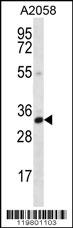 CNN2 Antibody (N-term) (Cat. APR03689G) western blot analysis in A2058 cell line lysates (35ug/lane).This demonstrates the CNN2 antibody detected the CNN2 protein (arrow).