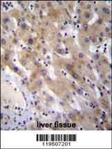 FGL1 Antibody (C-term) (Cat. APR03724G)immunohistochemistry analysis in formalin fixed and paraffin embedded human liver tissue followed by peroxidase conjugation of the secondary antibody and DAB staining.This data demonstrates the use of FGL1 Antibody (C-term) for immunohistochemistry. Clinical relevance has not been evaluated. |