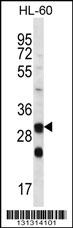 CA6 Antibody (C-term) (Cat. APR03727G) western blot analysis in HL-60 cell line lysates (35ug/lane).This demonstrates the CA6 antibody detected the CA6 protein (arrow).