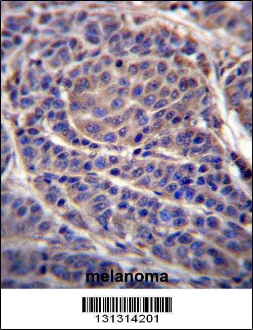 CA6 Antibody (C-term) (Cat. APR03727G)immunohistochemistry analysis in formalin fixed and paraffin embedded human melanoma followed by peroxidase conjugation of the secondary antibody and DAB staining.This data demonstrates the use of CA6 Antibody (C-term) for immunohistochemistry. Clinical relevance has not been evaluated. |