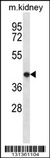 TNMD Antibody (Center) (Cat. APR03728G) western blot analysis in mouse kidney tissue lysates (35ug/lane).This demonstrates the TNMD antibody detected the TNMD protein (arrow). |