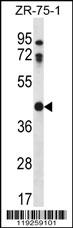 CTSO Antibody (N-term) (Cat. APR03735G) western blot analysis in ZR-75-1 cell line lysates (35ug/lane).This demonstrates the CTSO antibody detected the CTSO protein (arrow).