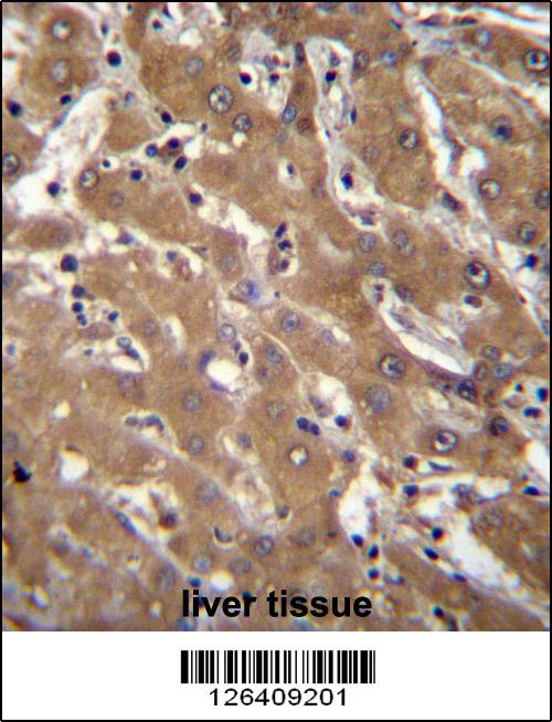 SPOPL Antibody (Center) (Cat. APR03736G)immunohistochemistry analysis in formalin fixed and paraffin embedded human liver tissue followed by peroxidase conjugation of the secondary antibody and DAB staining.This data demonstrates the use of SPOPL Antibody (Center) for immunohistochemistry. Clinical relevance has not been evaluated.