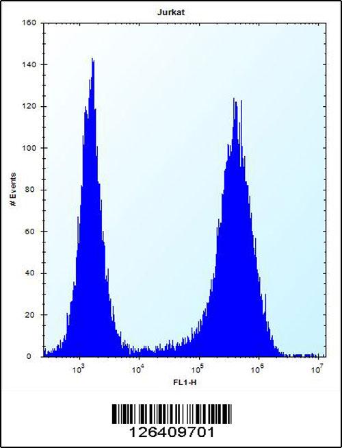 SPOPL Antibody (Center) (Cat. APR03736G) flow cytometric analysis of Jurkat cells (right histogram) compared to a negative control cell (left histogram).FITC-conjugated donkey-anti-rabbit secondary antibodies were used for the analysis. |