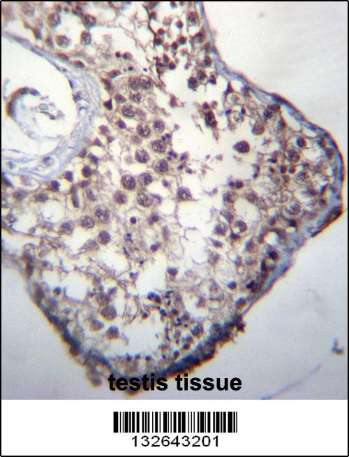 GLCCI1 Antibody (Center) (Cat. APR03748G)immunohistochemistry analysis in formalin fixed and paraffin embedded human testis tissue followed by peroxidase conjugation of the secondary antibody and DAB staining.This data demonstrates the use of GLCCI1 Antibody (Center) for immunohistochemistry. Clinical relevance has not been evaluated. |