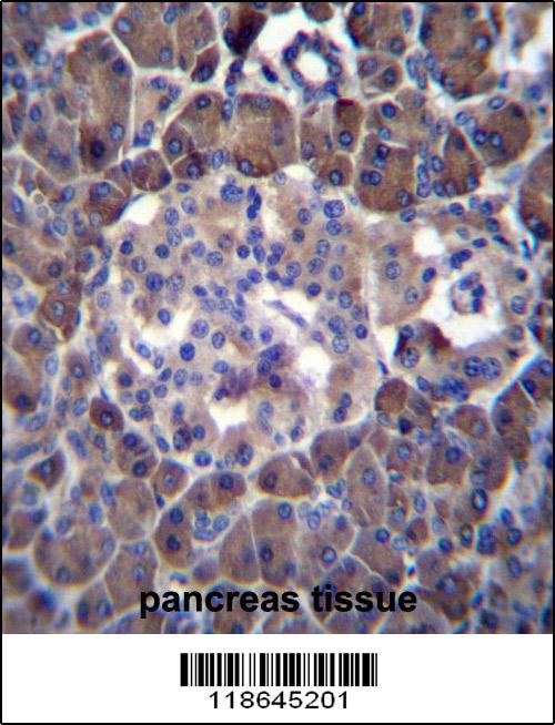 MLM Antibody (C-term) (Cat. APR03752G)immunohistochemistry analysis in formalin fixed and paraffin embedded human pancreas tissue followed by peroxidase conjugation of the secondary antibody and DAB staining.This data demonstrates the use of MLM Antibody (C-term) for immunohistochemistry. Clinical relevance has not been evaluated. |