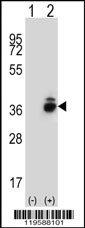 Western blot analysis of CRHBP (arrow) using rabbit polyclonal CRHBP Antibody (N-term) (Cat. APR03753G). 293 cell lysates (2 ug/lane) either nontransfected (Lane 1) or transiently transfected (Lane 2) with the CRHBP gene. |