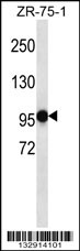 PHF14 Antibody (N-term) (Cat. APR03767G) western blot analysis in ZR-75-1 cell line lysates (35ug/lane).This demonstrates the PHF14 antibody detected the PHF14 protein (arrow). |