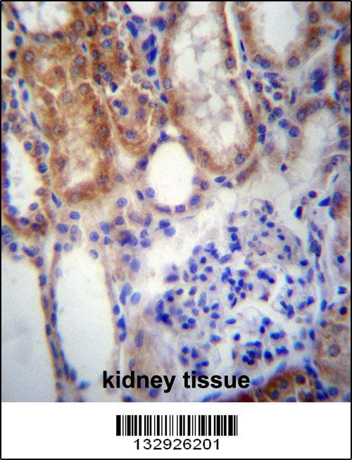 SUSD2 Antibody (C-term) (Cat. APR03769G)immunohistochemistry analysis in formalin fixed and paraffin embedded human kidney tissue followed by peroxidase conjugation of the secondary antibody and DAB staining.This data demonstrates the use of SUSD2 Antibody (C-term) for immunohistochemistry. Clinical relevance has not been evaluated. |