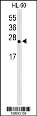 Western blot analysis of anti-Bcl-w BH3 domain Pab (Cat. APR03770G) in HL-60 cell lysate. Bcl-w BH3 domain (arrow) was detected using purified Pab. Secondary HRP-anti-rabbit was used for signal visualization with chemiluminescence.