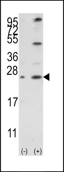 Western blot analysis of Bcl-w3 (arrow) using rabbit polyclonal Bcl-w BH3 Domain Antibody (Cat.APR03770G). 293 cell lysates (2 ug/lane) either nontransfected (Lane 1) or transiently transfected with the BCL2L2 gene (Lane 2) (Origene Technologies).