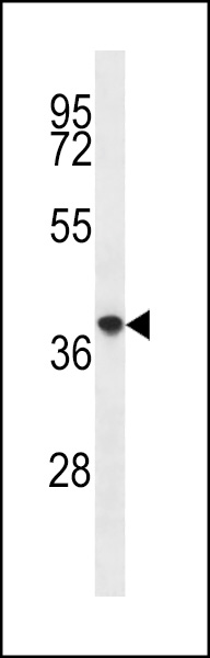 PQLC2 Antibody (C-term) (Cat. APR03775G) western blot analysis in mouse spleen tissue lysates (35ug/lane).This demonstrates the PQLC2 antibody detected the PQLC2 protein (arrow).