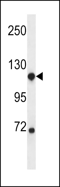 NDST1 Antibody (C-term) (Cat. APR03791G) western blot analysis in CEM cell line lysates (35ug/lane).This demonstrates the NDST1 antibody detected the NDST1 protein (arrow).