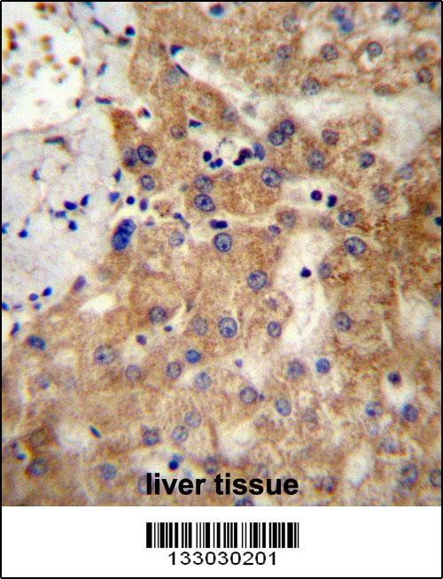 NDST1 Antibody (C-term) (Cat. APR03791G)immunohistochemistry analysis in formalin fixed and paraffin embedded human liver tissue followed by peroxidase conjugation of the secondary antibody and DAB staining.This data demonstrates the use of NDST1 Antibody (C-term) for immunohistochemistry. Clinical relevance has not been evaluated. |