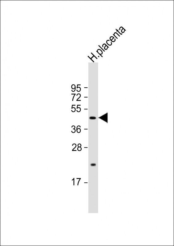 Anti-SGPP1 Antibody (N-term) at 1:1000 dilution + human placenta lysate Lysates/proteins at 20 μg per lane. Secondary Goat Anti-Rabbit IgG, (H+L), Peroxidase conjugated at 1/10000 dilution. Predicted band size : 49 kDa Blocking/Dilution buffer: 5% NFDM/TBST.