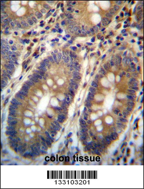 ASMTL Antibody (Center) (Cat. APR03793G)immunohistochemistry analysis in formalin fixed and paraffin embedded human colon tissue followed by peroxidase conjugation of the secondary antibody and DAB staining.This data demonstrates the use of ASMTL Antibody (Center) for immunohistochemistry. Clinical relevance has not been evaluated. |