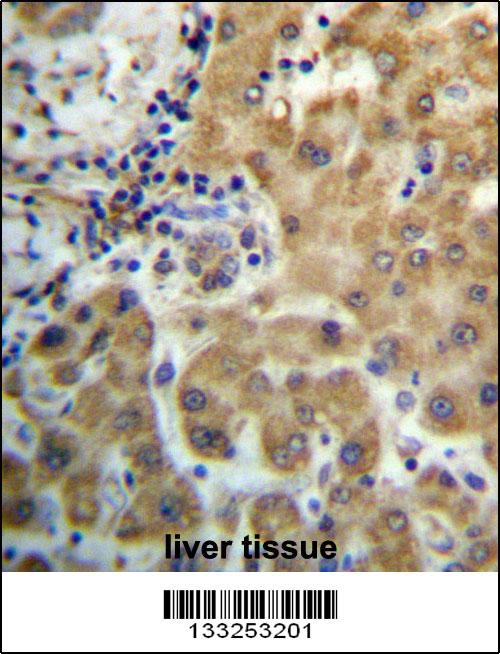 TRIM4 Antibody (N-term) (Cat. APR03797G)immunohistochemistry analysis in formalin fixed and paraffin embedded human liver tissue followed by peroxidase conjugation of the secondary antibody and DAB staining.This data demonstrates the use of TRIM4 Antibody (N-term) for immunohistochemistry. Clinical relevance has not been evaluated. |