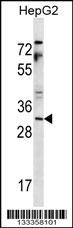 C7orf36 Antibody (Center) (Cat. APR03804G) western blot analysis in HepG2 cell line lysates (35ug/lane).This demonstrates the C7orf36 antibody detected the C7orf36 protein (arrow).
