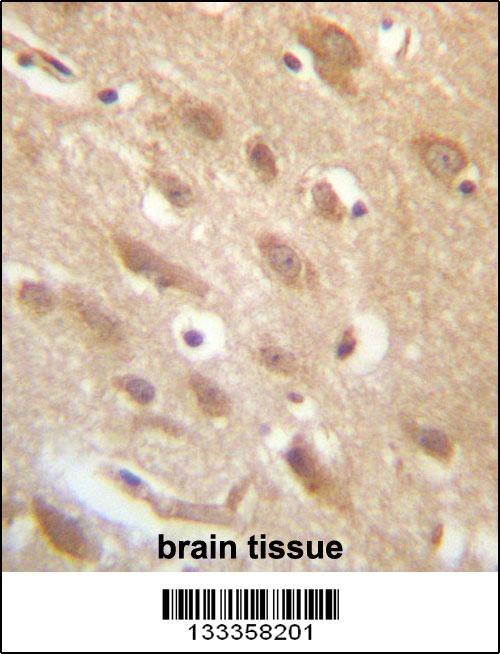 C7orf36 Antibody (Center) (Cat. APR03804G)immunohistochemistry analysis in formalin fixed and paraffin embedded human brain tissue followed by peroxidase conjugation of the secondary antibody and DAB staining.This data demonstrates the use of C7orf36 Antibody (Center) for immunohistochemistry. Clinical relevance has not been evaluated. |