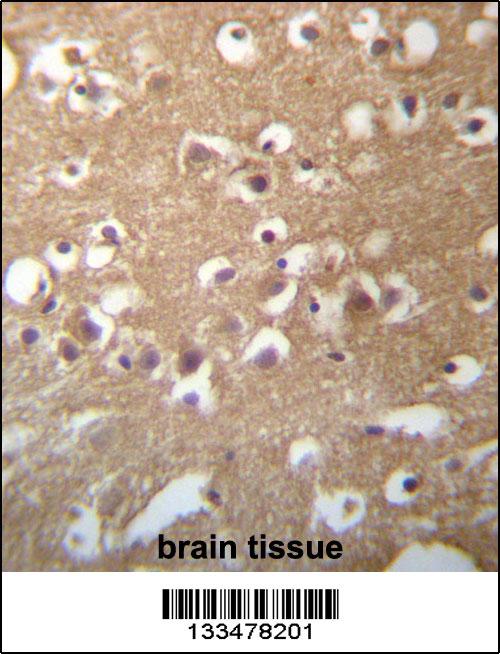 TMCC3 Antibody (Center) (Cat. APR03806G)immunohistochemistry analysis in formalin fixed and paraffin embedded human brain tissue followed by peroxidase conjugation of the secondary antibody and DAB staining.This data demonstrates the use of TMCC3 Antibody (Center) for immunohistochemistry. Clinical relevance has not been evaluated. |