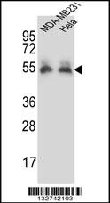 PRCP Antibody (N-term) (Cat. APR03813G) western blot analysis in MDA-MB231,Hela cell line lysates (35ug/lane).This demonstrates the PRCP antibody detected the PRCP protein (arrow).