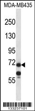 MID1 Antibody (C-term) (Cat. APR03818G) western blot analysis in MDA-MB435 cell line lysates (35ug/lane).This demonstrates the MID1 antibody detected the MID1 protein (arrow). |
