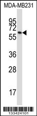 BTN3A1 Antibody (C-term) (Cat. APR03824G) western blot analysis in MDA-MB231 cell line lysates (35ug/lane).This demonstrates the BTN3A1 antibody detected the BTN3A1 protein (arrow). |